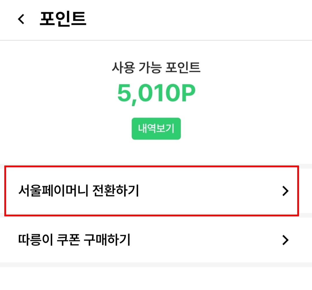 포인트가 쌓였으니 서울페이로 전환하여 실제 현금처럼 사용해 보실 수 있습니다.