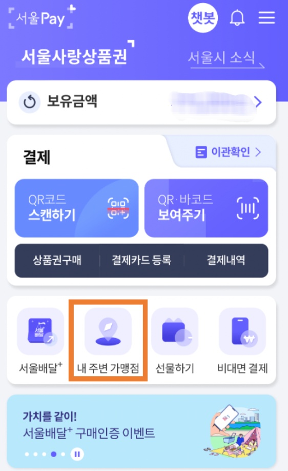 서울페이 앱 → 내 주변 가맹점 클릭하면 결제 가능한 내 주변 가맹점들을 검색하실 수 있습니다.